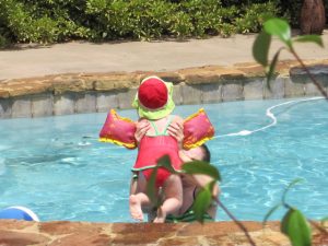 Macy has loved being in the water this summer. While we were at the beach, she learned to stand on the top step in the pool and jump (which is more like a forceful fall) to me. We started with her back to me and she would just fall back. Then she got a little more brave and would turn to face me before she jumped. I didn’t want to give her the option of jumping from the side of the pool while we were there because there were too many people for me to feel comfortable about her getting out on her own. Ramona’s pool gave her the perfect opportunity to jump to mommy from the side of the pool. She did a good job…especially since she just learned how to jump with both feet last week. 😉 I’m so excited that she loves the water!