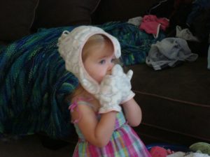 She even went back for more the next day.  Her hat and gloves have now joined the ranks of her other “friends” and go to bed with her every night.  🙂