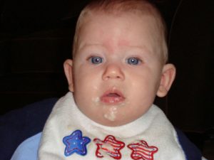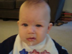 I’m late posting this (shocking, I know), so Steven has been eating rice cereal for 2 or 3 weeks.  He’s struggled with keep his tongue in check to keep the cereal in his mouth, but he’s getting better.  Despite his first faces, he loves his cereal!