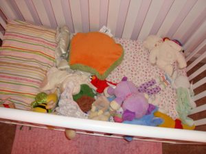 The funny thing was that she wasn’t even close to her pillow.  She was in the little polka dotted section with both of her sock monkey’s legs under her…no wonder I didn’t see her from the door!